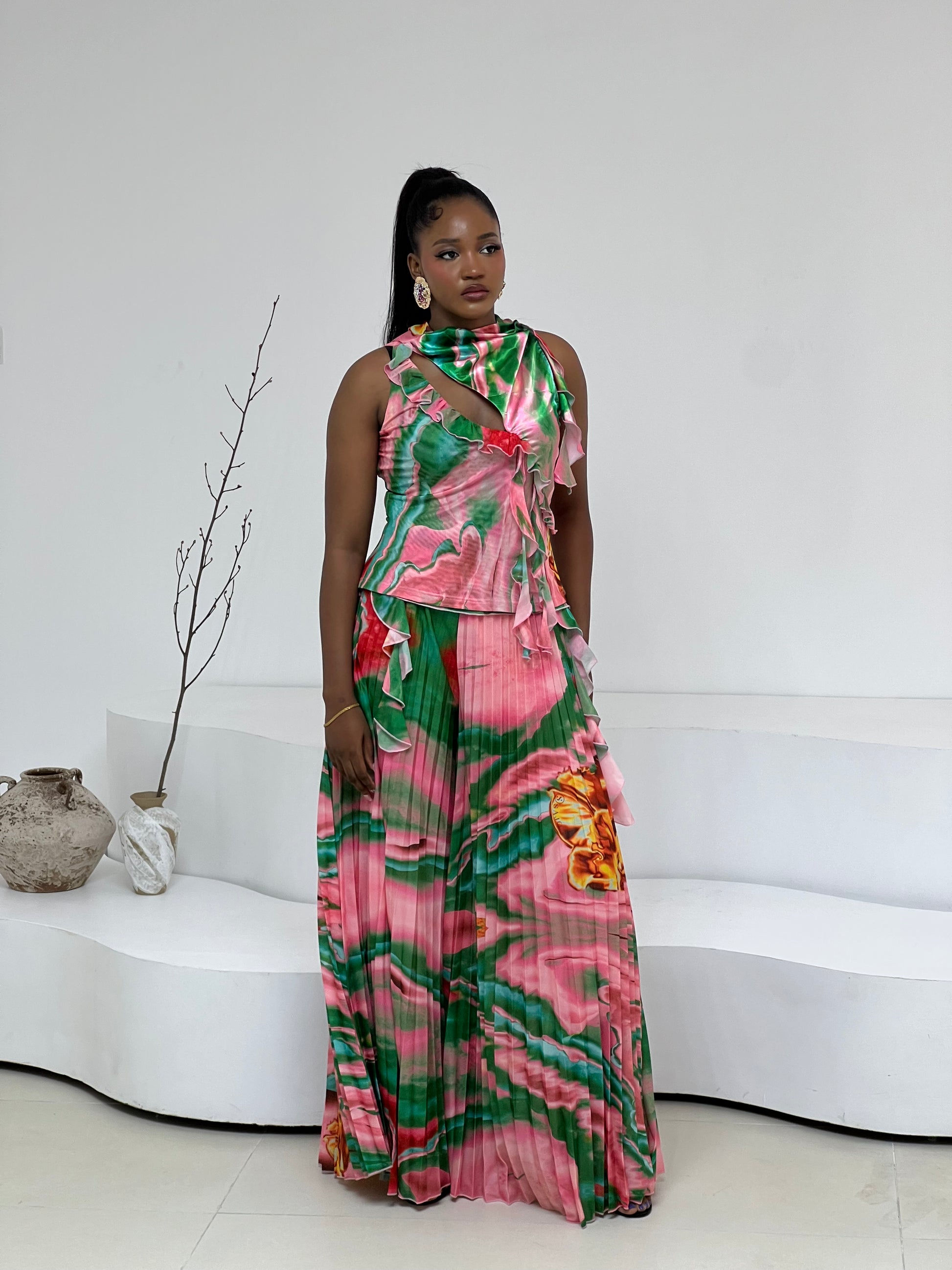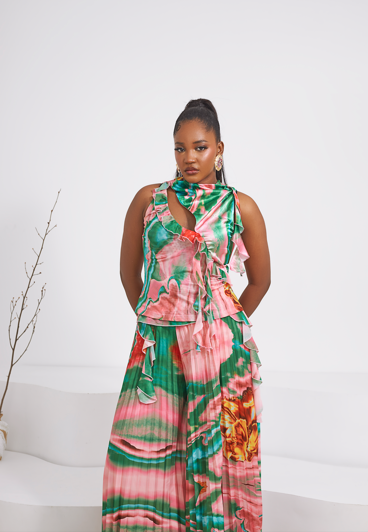 Effortlessly feminine, this top features delicate ruffles along the sleeves and a subtle front slit for a hint of cleavage, adding just the right touch of allure. Designed to flatter without compromising comfort, it pairs beautifully with high-waisted bottoms or stands out on its own for an elevated look.
